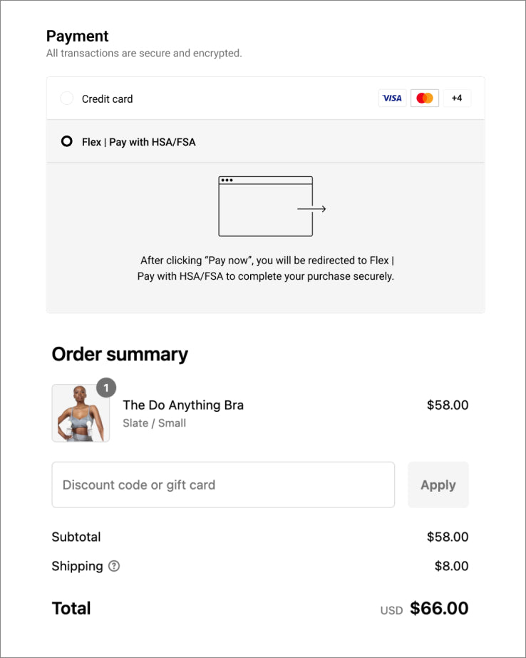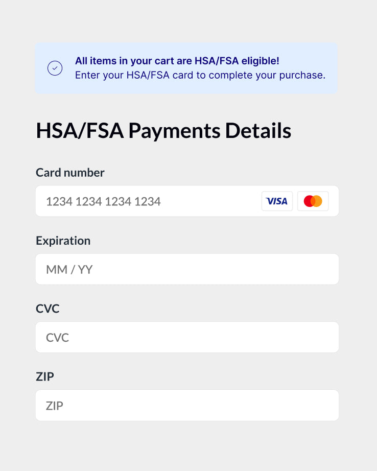 To use your HSA or FSA debit card, add products to your cart as usual. At checkout, select “Flex | Pay with HSA/FSA” as your payment option, enter your HSA or FSA debit card, and complete your checkout as usual. If your cart contains both eligible and ineligible items, you will be prompted to enter your HSA or FSA debit card information, along with your credit or debit card, on the same screen.If you don’t see “Flex | Pay with HSA/FSA,” you may be in Shop Pay. Select “checkout as guest” to view more payment options.