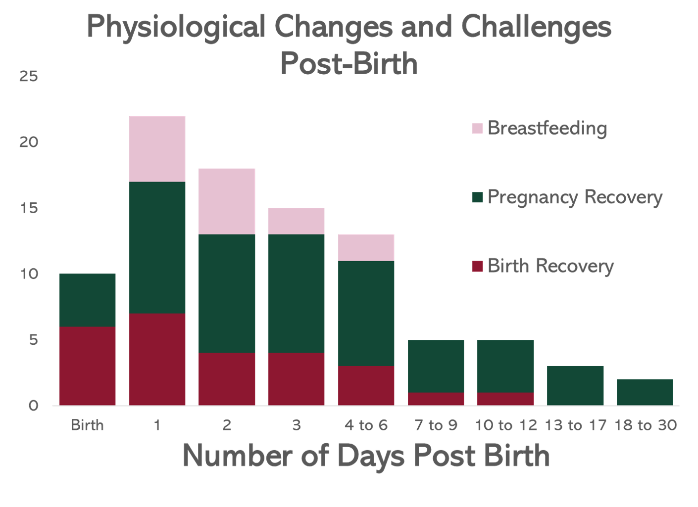 If you are breastfeeding, the body is working to identify how much milk to produce based on specific signals, including the duration and frequency of nursing or pumping sessions. Common challenges include adjusting to the near-constant feeding schedule and milk production: Sometimes supply can seem low, and at times it can be overly abundant and cause problems with latching, engorgement and pain. Optimizing nursing positions and latching techniques to prevent sore nipples (which affects roughly 50% of people who breastfeed) can make a world of difference.