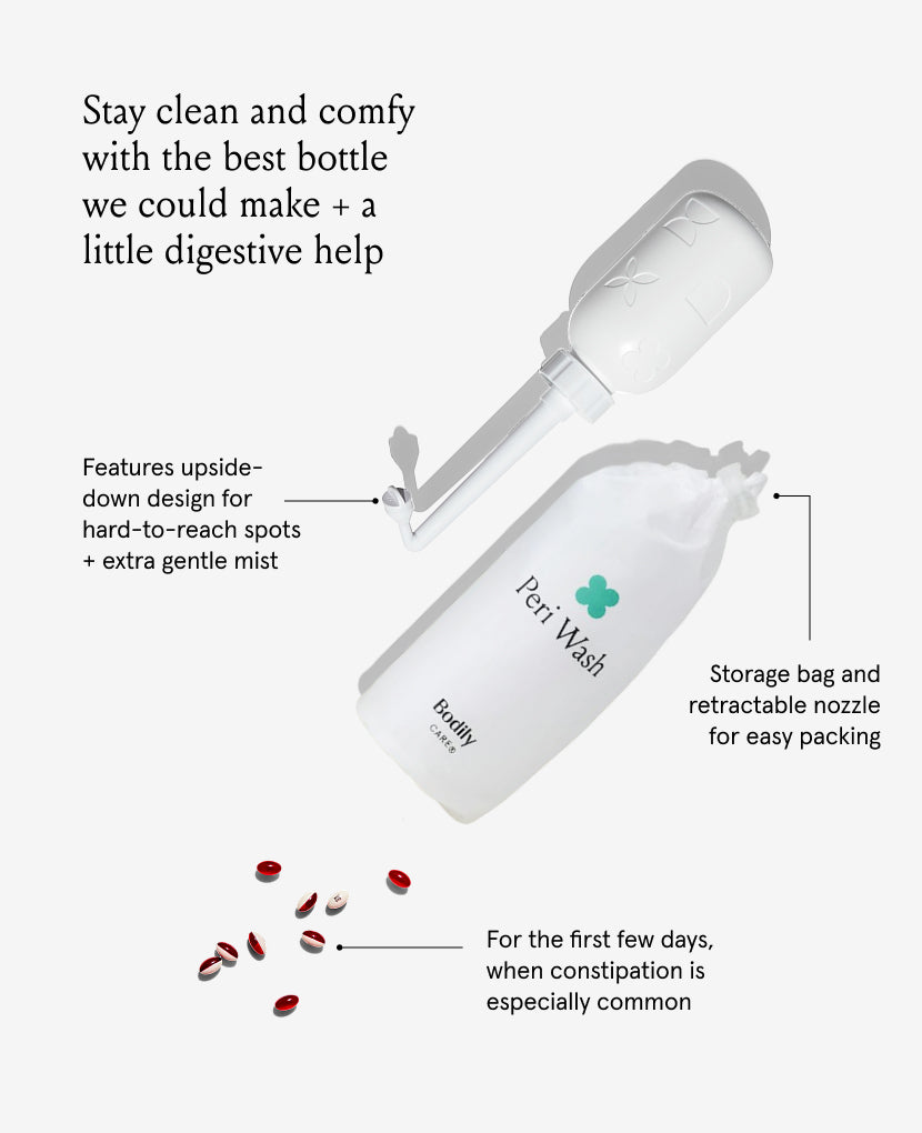 Inside: ultra-soft, reusable recovery underwear (no quasi-diapers here), organic non-slip nursing pads, hydrogel nipple pads for instant relief, 24 cloud-soft maxi pads, slouch socks with silicone tread bottoms (because hospital socks are just... no), and a chic retractable peri bottle (beautiful enough to leave out). Plus: stool softener—because yes, you’ll need it.