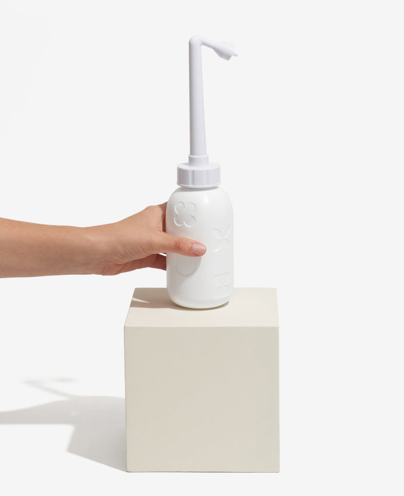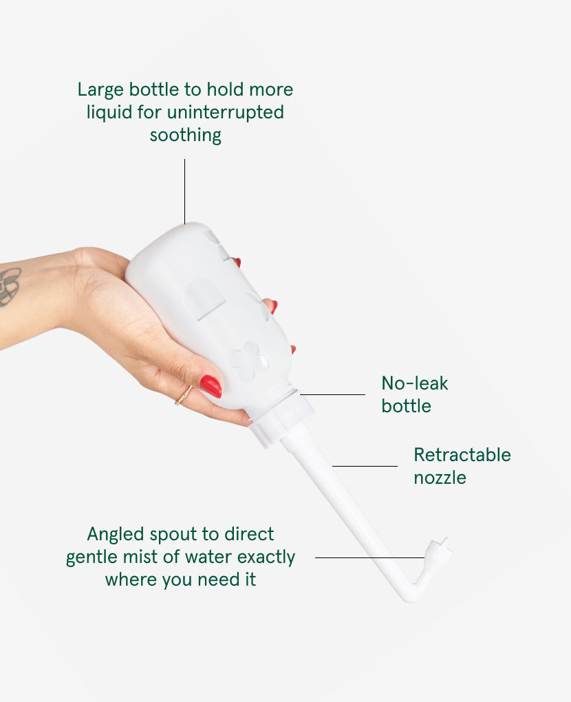 Take the sting out of bathroom visits with a spritz of warm water whenever you pee. This upside-down and angled-spout postpartum peri wash bottle dilutes the stinging effect of urine on your sore or stitched perineum after vaginal birth, and helps direct water only to the areas that need it.